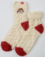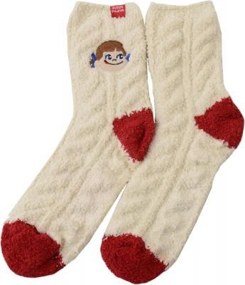 ペコちゃんの刺しゅうが入ったルームソックス。滑り止め付きなので安心です。